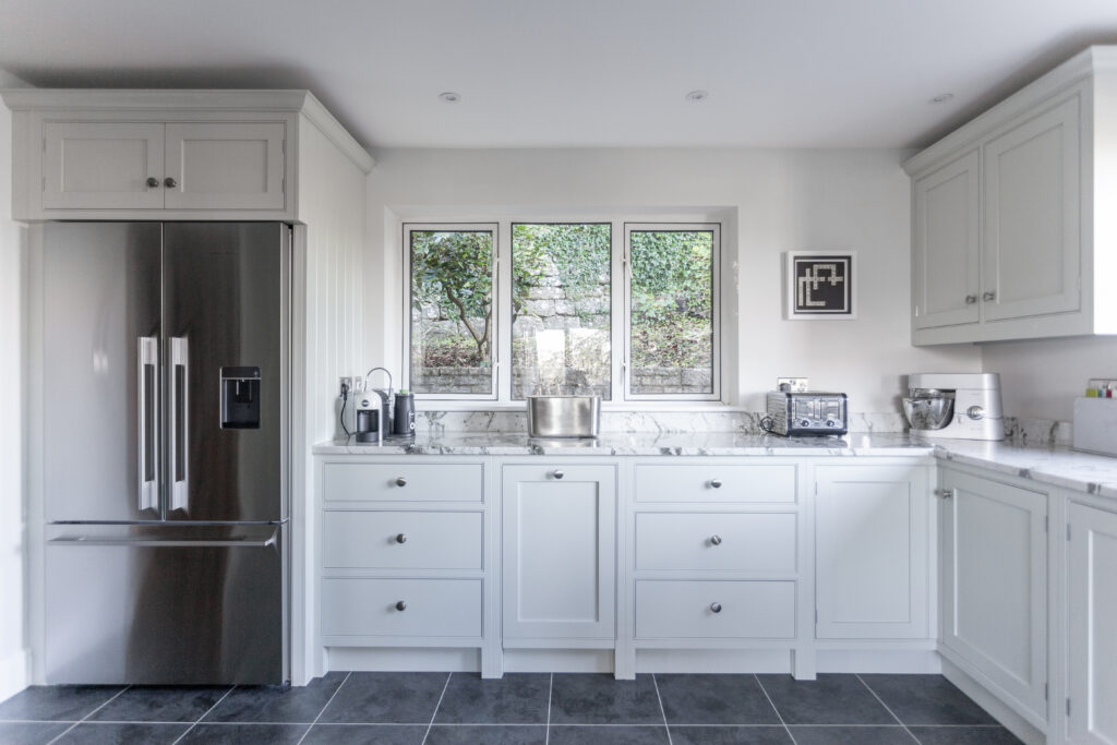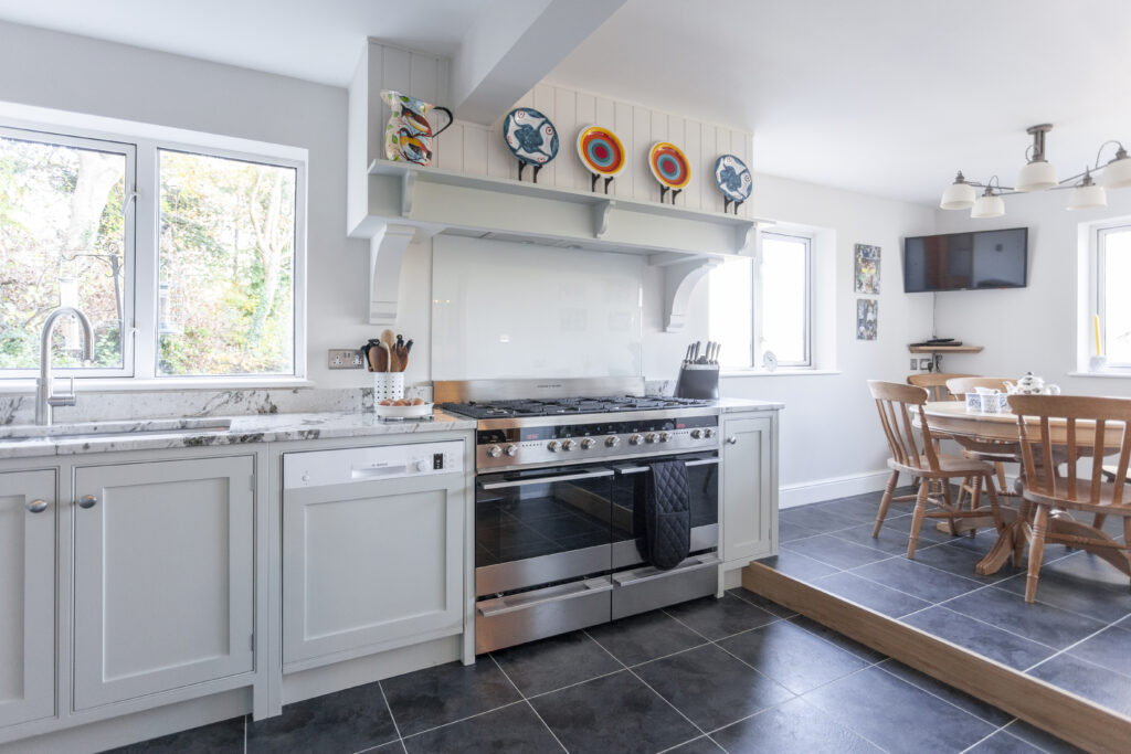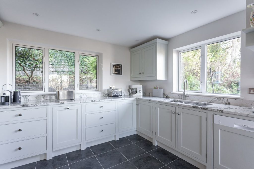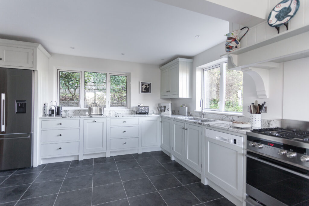 However the team at WCM soon brought it into 2021. The wall with the arch was removed as were the tired and dated kitchen units. Then the team tackled the whole project from re-wiring, re-plastering, re-plumbing and re-flooring to create a beautiful hand-made kitchen, main theme white, hand-painted in Cromarty by F & B.