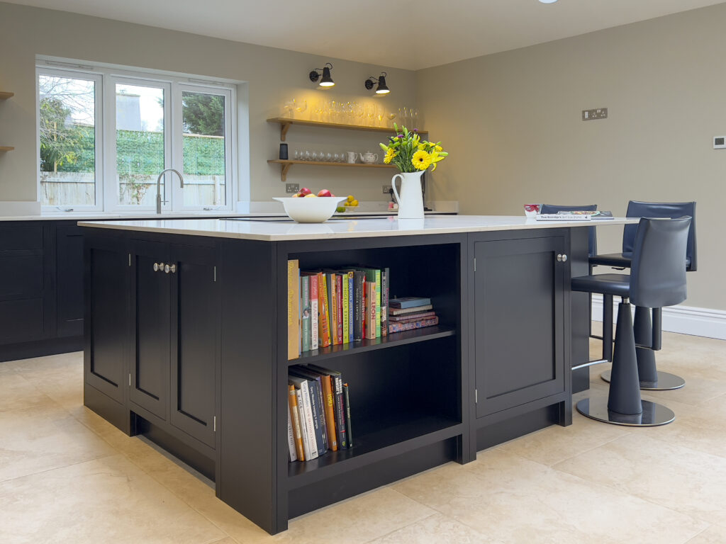 The huge space demanded a huge island with an overhang for seating for three people. They didn’t want any wall units and chose oak shelving instead.