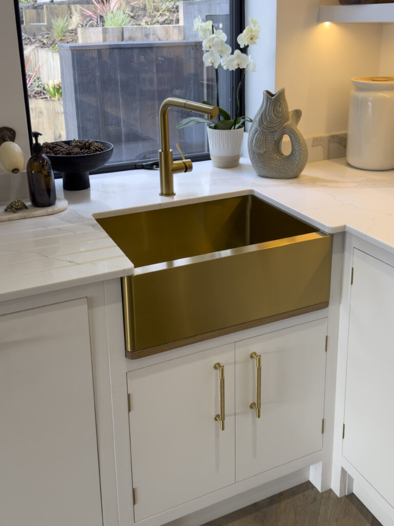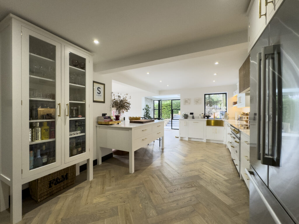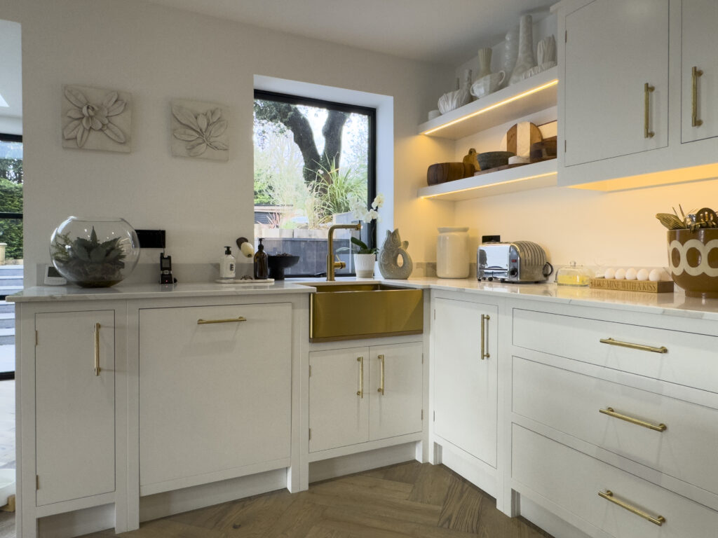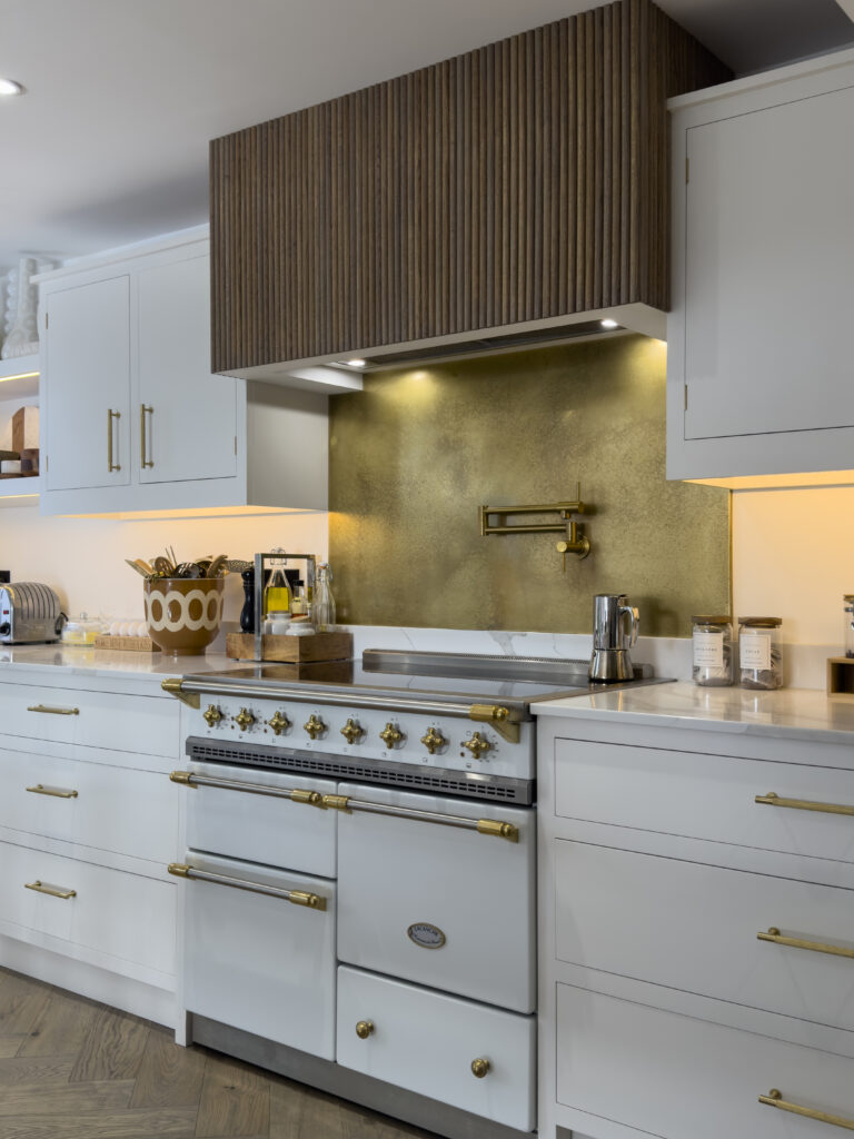 Our clients chose a herringbone oak floor to compliment the white cabinetry and gold handles! A gold Belfast sink and tap surrounded by ‘Calacatta Dante’ quartz worktops along with a gold splashback and pot-filler behind the range cooker completed the look.