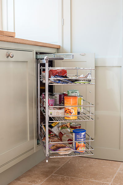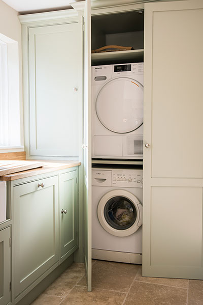 With a new husband and even newer baby, Martine moved into her village home only to find a higgledy-piggledy kitchen in uninspiring brown and no useful utility room. Now it’s an oasis of calm with beautifully-fitted cabinetry in soft tones of 'Minty Vert de Terre' by Farrow & Ball, hand-made oak worktops, a big double sink and a grooved draining-board – removeable for hygiene purposes. Meanwhile the washing machine and dryer are hidden behind a door with the dryer perched on a shelf above the washer, well out of view..