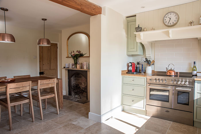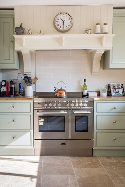An oasis of calm with beautifully-fitted cabinetry in soft tones of 'Minty Vert de Terre' by Farrow & Ball.