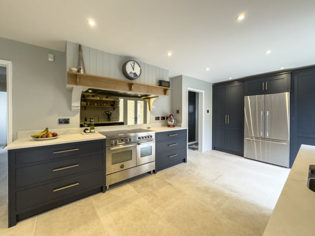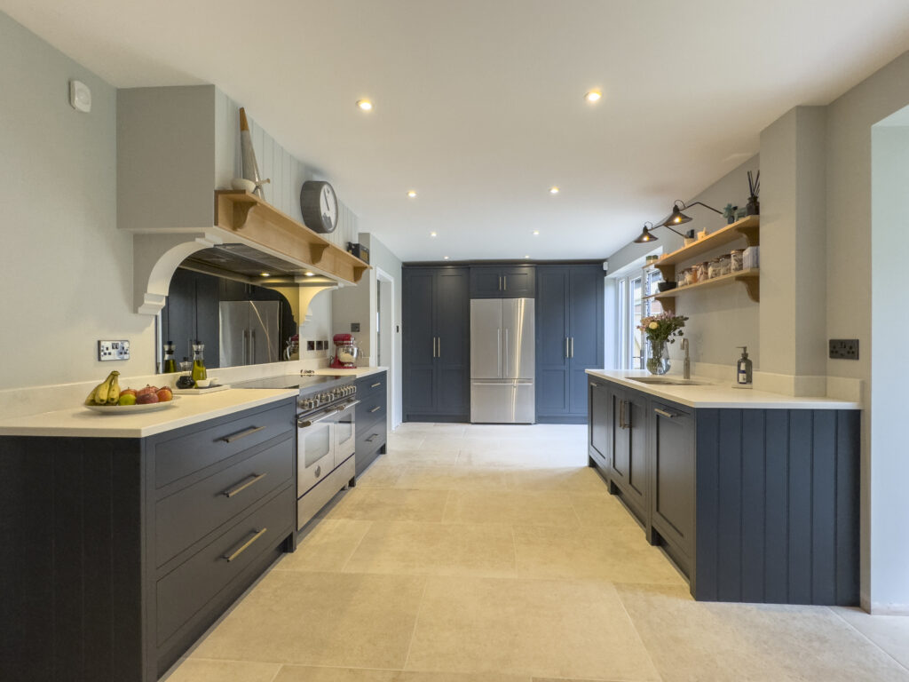 Our clients created one big open area from their existing kitchen and dining room for us to then make and fit this beautiful hand-made kitchen, hand-painted in ‘Railings’ by Farrow & Ball and finished off with 30mm thick ‘Cloudy Gris’ quartz worktops.