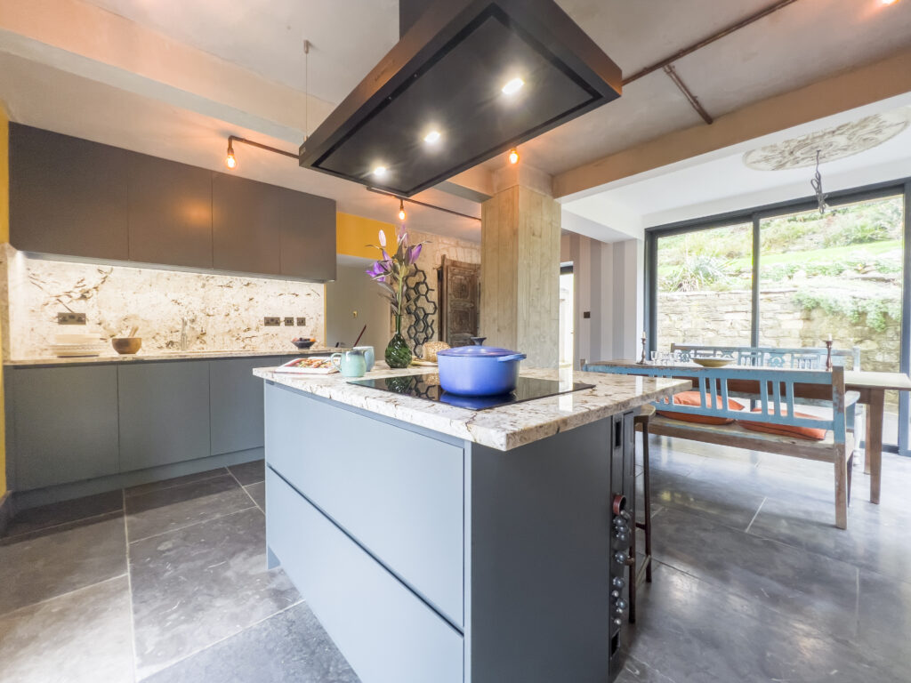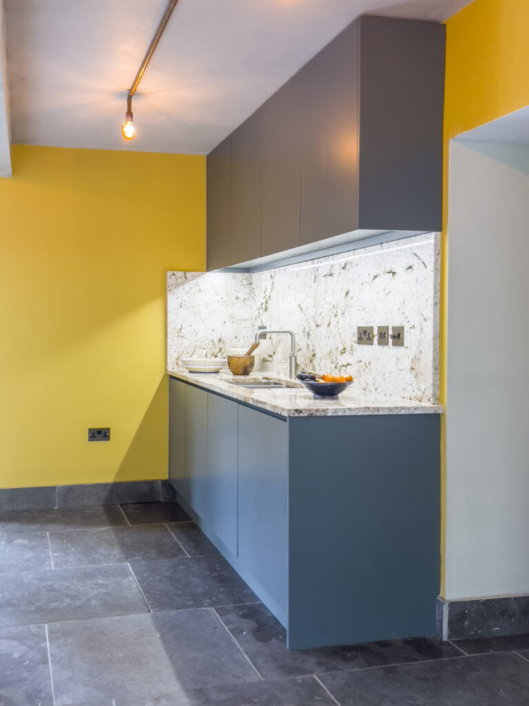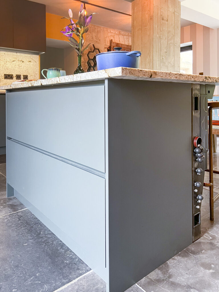 We combined hand-painted flat soft-close doors with oak ones and 30mm 'Tartufo' granite worktops completed the look.