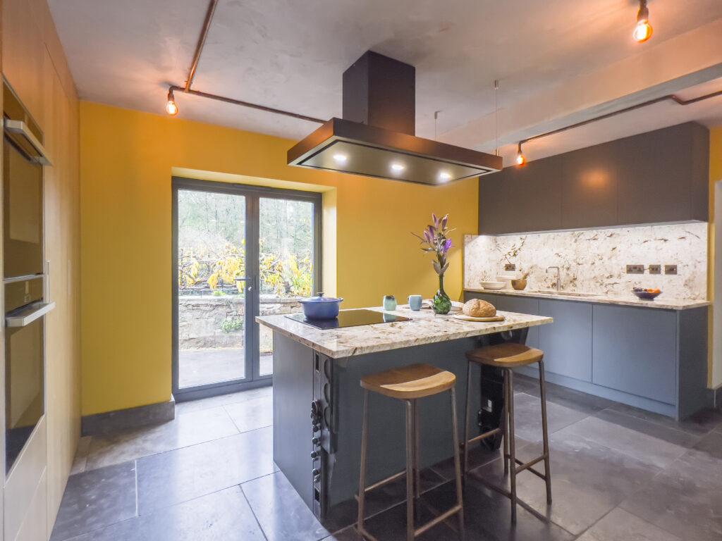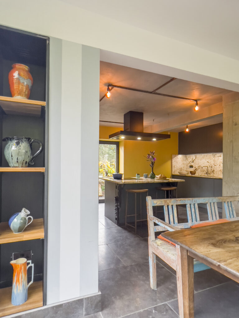 The concrete ceilings in this kitchen, the wood clad column and the exposed pipework gave this kitchen we did recently a very industrial feel!