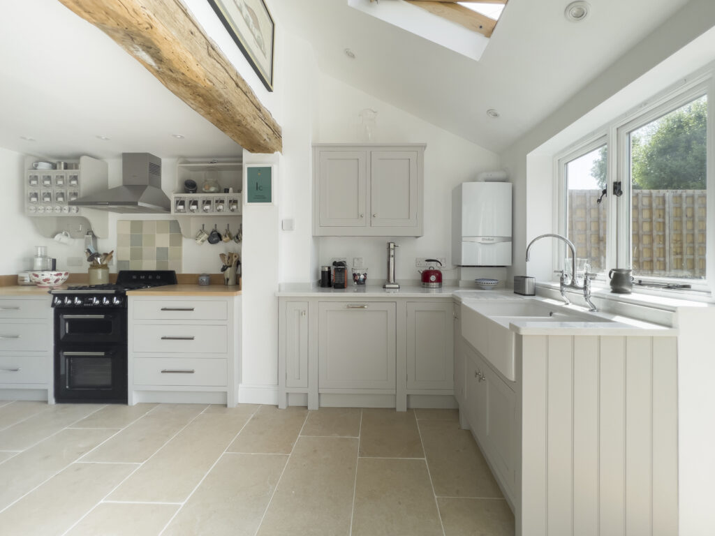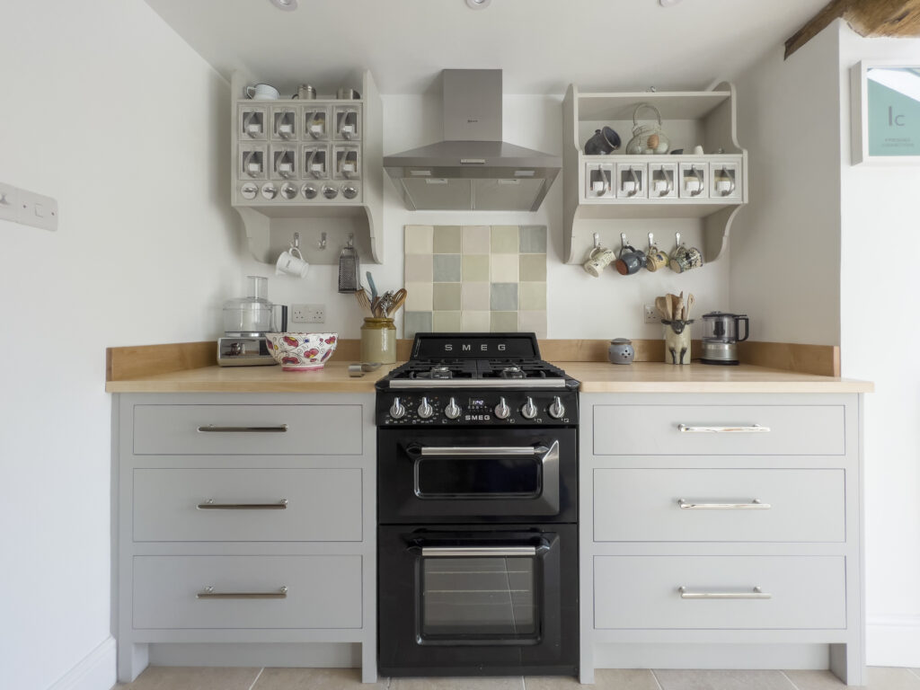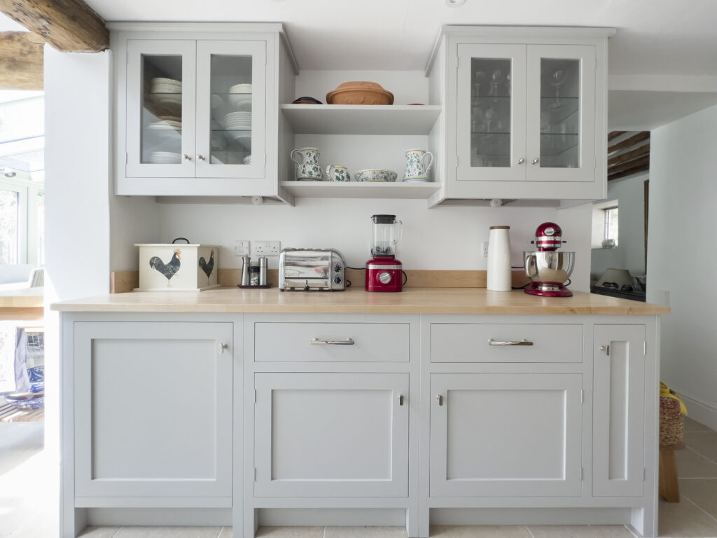Our clients chose a mixture of hand-made Maple and 30mm thick Bianco Nuvolo Arenastone worktops. All of the shaker style cabinets were hand-painted in French Gray by Farrow & Ball.