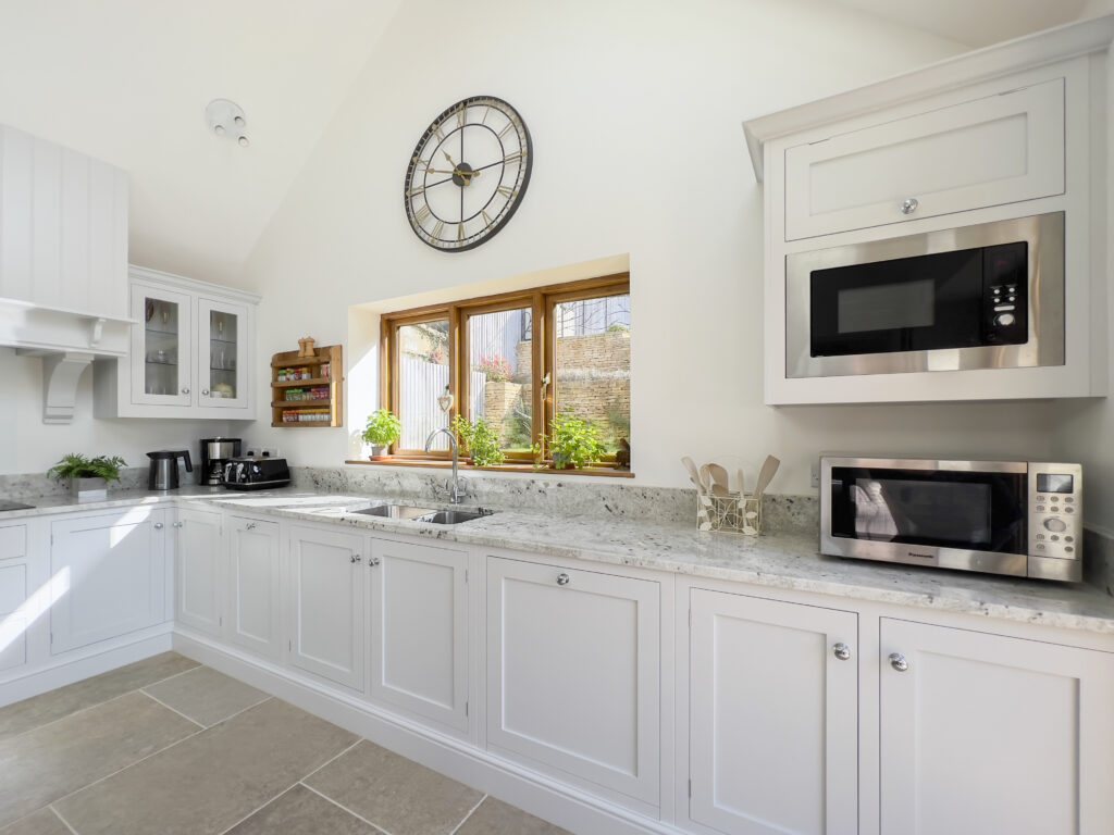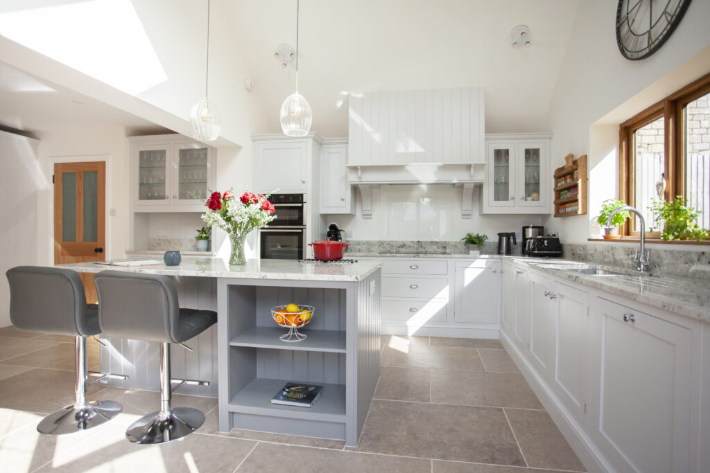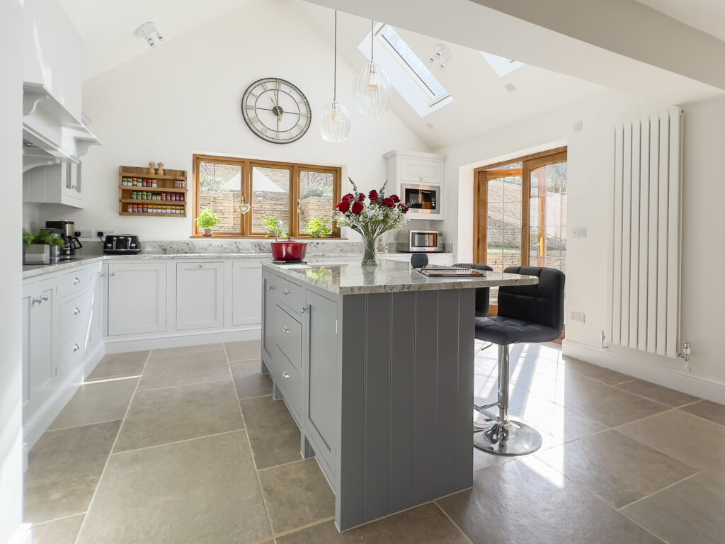 Our clients had a brand-new extension with a vaulted ceiling and they wanted hand-made, hand-painted cabinets for the kitchen and utility room.