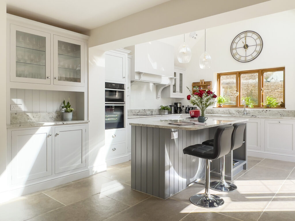 The cabinets around the walls were hand-painted in ‘Dimpse’ by Farrow & Ball and the central island units were painted in ‘Plummet’ by Farrow & Ball. These beautiful colours were complimented by their choice of 'Colonial White' granite worktops, and we think the final result was simply stunning!!