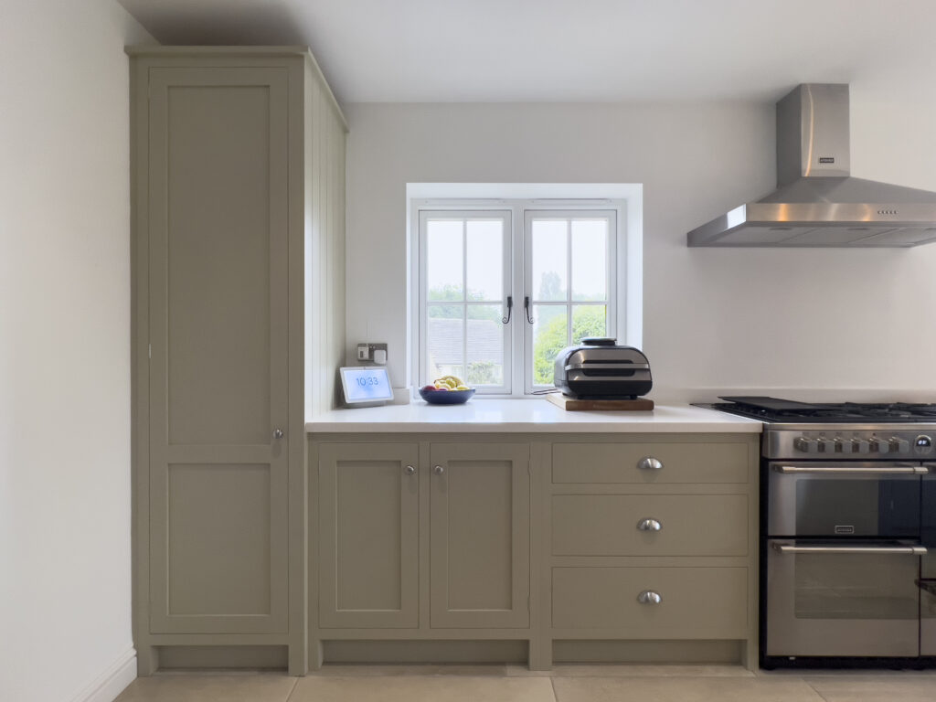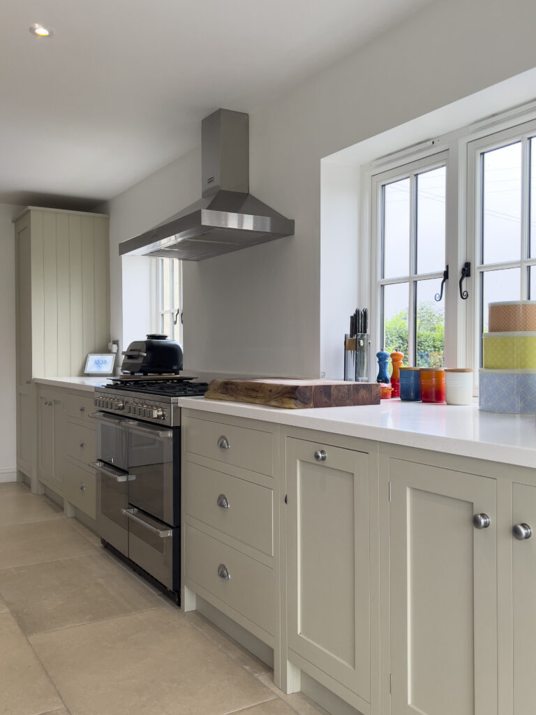 Our clients chose Stiffkey Blue and Old White by Farrow & Ball for all the cabinetry and the resin worktops also included moulded undermounted sinks with stainless steel bottoms.