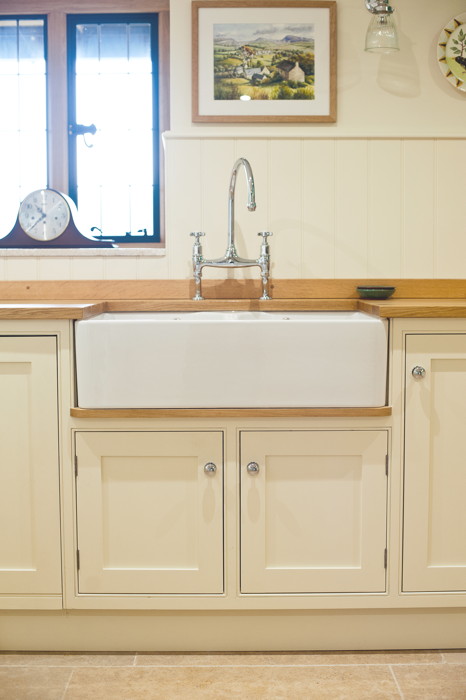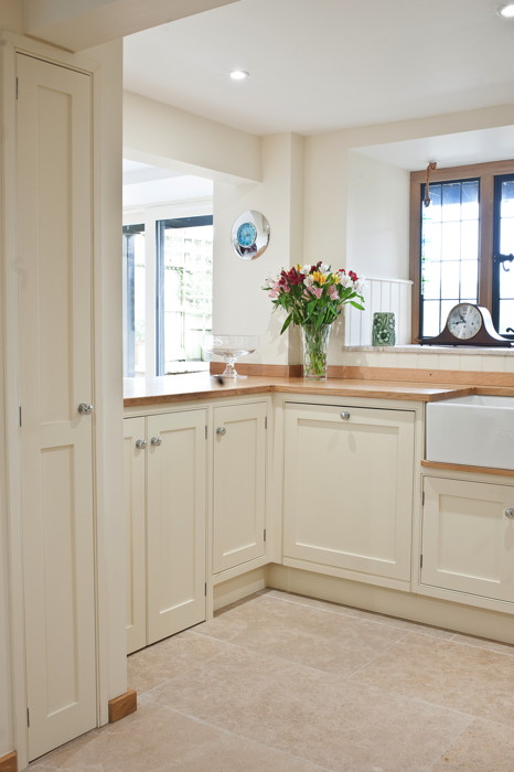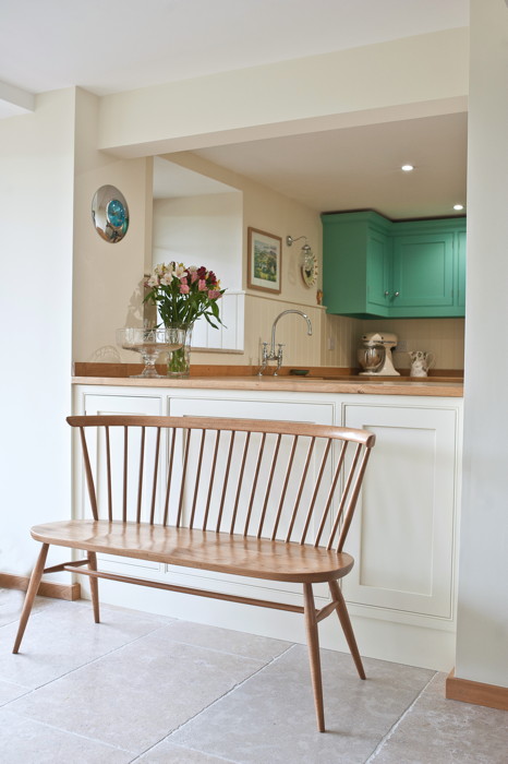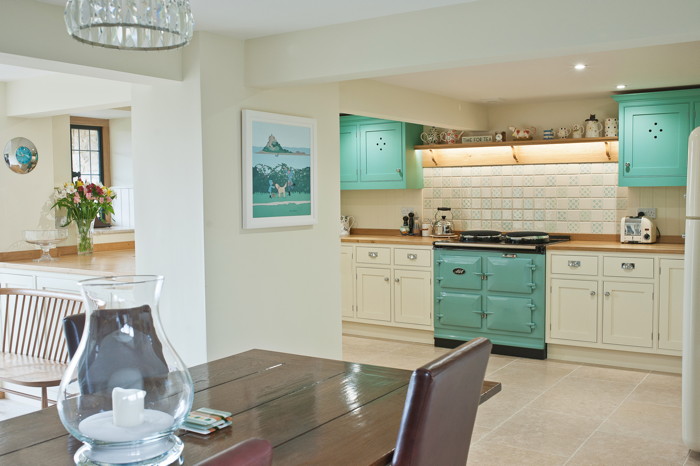 WCM designed and hand-made their new units then painted them in 'White Lead' and a beautiful duck egg blue called 'Turquoise Blue' (both by The Little Greene Paint Co) to match the brilliant turquoise Aga. Oak worktops and limestone flooring completed the look.